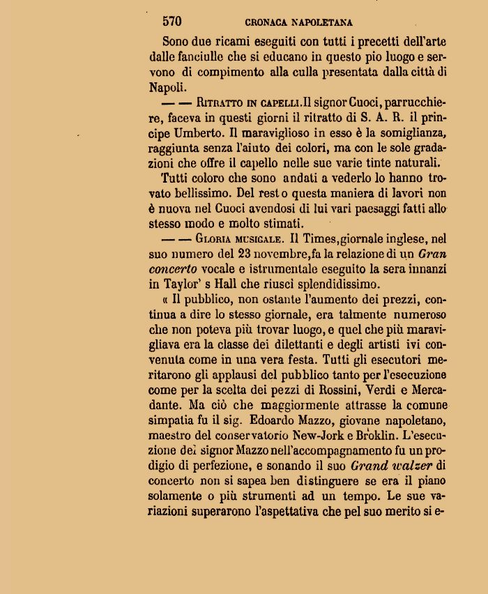« Il pubblico, non ostante l'aumento dei prezzi, continua a dire lo stesso giornale, era talmente numeroso che non poteva più trovar luogo, e quel che più maravigliava era la classe dei dilettanti e degli artisti ivi convenuta come in una vera festa. Tutti gli esecutori meritarono gli applausi del pubblico tanto per l'esecuzione come per la scelta dei pezzi di Rossini, Verdi e Merca-dante. Ma ciò che maggiormente attrasse la comune simpatia fu il sig. Edoardo Mazzo, giovane napoletano, maestro del conservatorio New-Jork e Broklin. L'esecuzione dei signor Mazzo nell'accompagnamento fu un prodigio di perfezione, e sonando il suo Grand walzer di concerto non si sapea ben distinguere se era il piano solamente o più strumenti ad un tempo. Le sue variazioni superarono l'aspettativa che pel suo merito sì e-