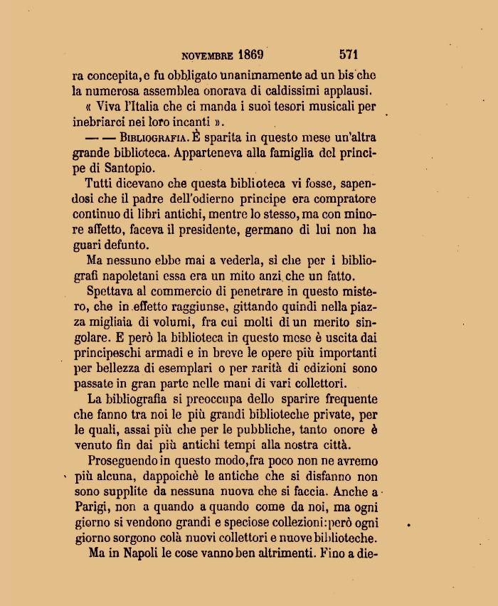 Spettava al commercio di penetrare in questo mistero, che in effetto raggiunse, gittando quindi nella piazza migliaia di volumi, fra cui molti di un merito singolare. E però la biblioteca in questo mese è uscita dai principeschi armadi e in breve le opere più importanti per bellezza di esemplari o per rarità di edizioni sono passate in gran parte nelle mani di vari collettori.