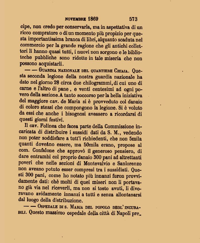 --Guardia nazionale del quartiere Chiaia. Questa seconda legione della nostra guardia nazionale ha dato nel giorno 28 circa due chilogrammi, di cui uno di carne e l'altro di pane , e venti centesimi ad ogni povero della sezione.A tanto soccorso perla bella iniziativa del maggiore cav. de Maria si è provveduto col danaio di coloro stessi che compongono la legione. Si è voluto da essi che anche i bisognosi avessero a ricordarsi di questi giorni festivi.