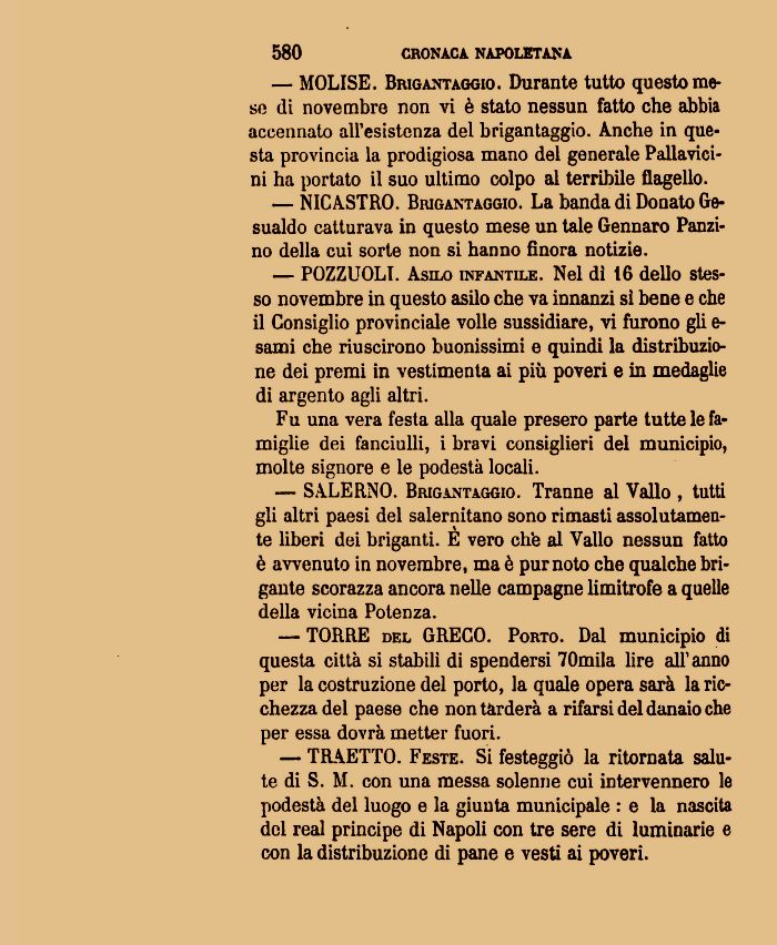 — MOLISE. Brigantaggio. Durante tutto questo mese di novembre non vi è stato nessun fatto che abbia accennato all'esistenza del brigantaggio. Anche in questa provincia la prodigiosa mano del generale Pallavicini ha portato il suo ultimo colpo al terribile flagello.