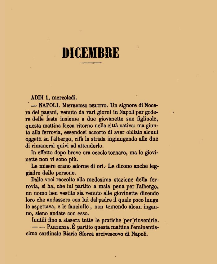 — NÀPOLI. Misterioso delitto. Un signore di Noce-ra dei pagani, venuto da vari giorni in Napoli per godere delle feste insieme a due giovanetto sue figliuole, questa mattina facea ritorno nella città nativa: ma giunto alla ferrovia, essendosi accorto di aver obliato alcuni oggetti su l'albergo, rifà la strada ingiungendo alle due di rimanersi quivi ad attenderlo.