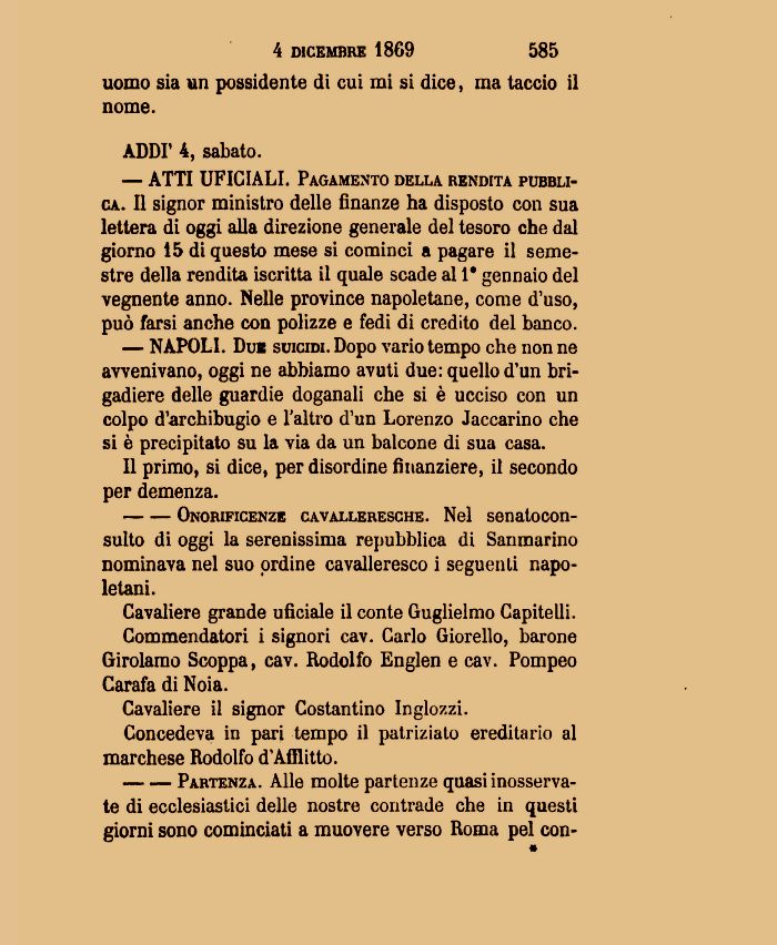 — NAPOLI. Due suicidi. Dopo vario tempo che non ne avvenivano, oggi ne abbiamo avuti due: quello d'un brigadiere delle guardie doganali che si è ucciso con un colpo d'archibugio e l'altro d'un Lorenzo Jaccarino che si è precipitato su la vìa da un balcone di sua casa.