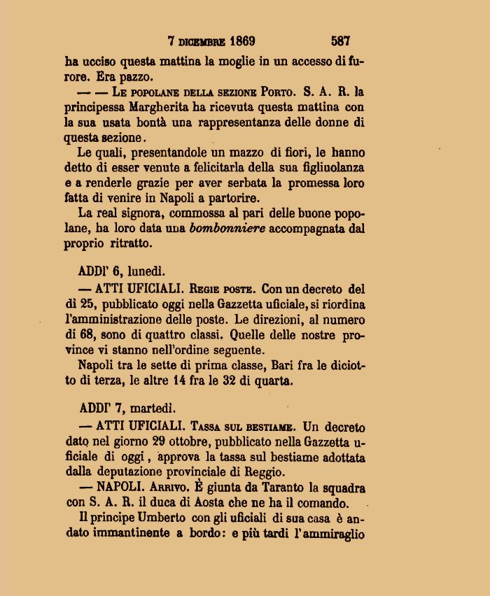Le quali, presentandole un mazzo di fiori, le hanno detto di esser venute a felicitarla della sua figli uolanza e a renderle grazie per aver serbata la promessa loro fatta di venire in Napoli a partorire.
