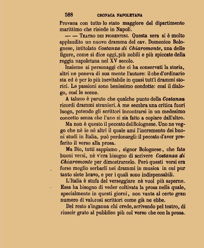 Ma Dio, tutti sappiamo , signor Bolognese, che fate buoni versi, nè v'era bisogno di scrivere Costanza di Chiaromonte per dimostrarcelo. Però questi versi era forse meglio serbarli nei drammi in musica in cui pur tanto siete bravo, e per i quali sono indispensabili.