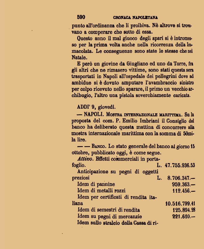 — NAPOLI. Mostra internazionale marittima. Su la proposta del com. P. Emilio Imbriani il Consiglio del banco ha deliberato questa mattina di concorrere alla mostra internazionale marittima con la somma di 50mi-la lire.