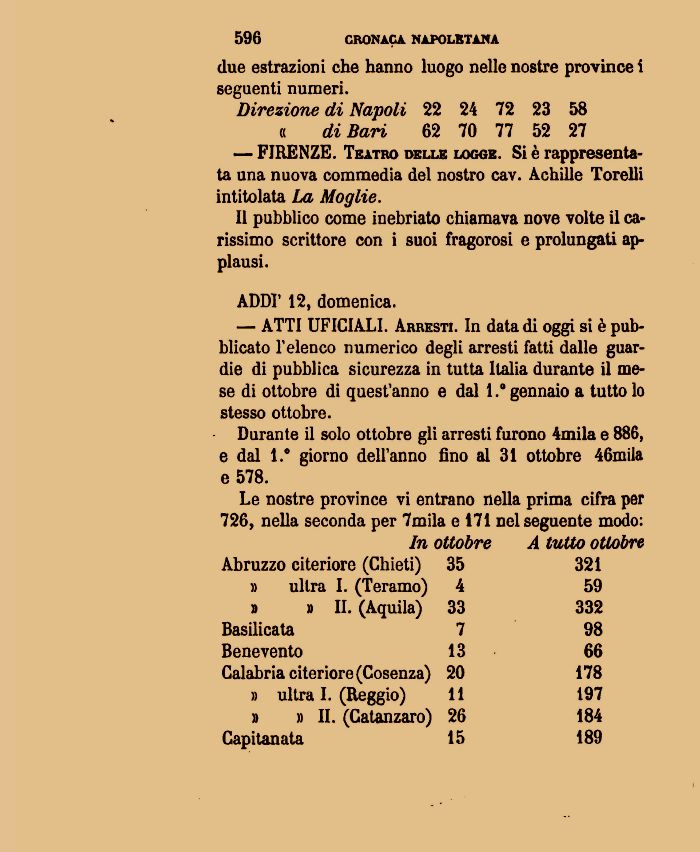 — ATTI UFICIALI. Arresti. In data di oggi si è pubblicato l'elenco numerico degli arresti fatti dalle guardie di pubblica sicurezza in tutta Italia durante il mese di ottobre di quest'anno e dal 1.° gennaio a tutto lo stesso ottobre.