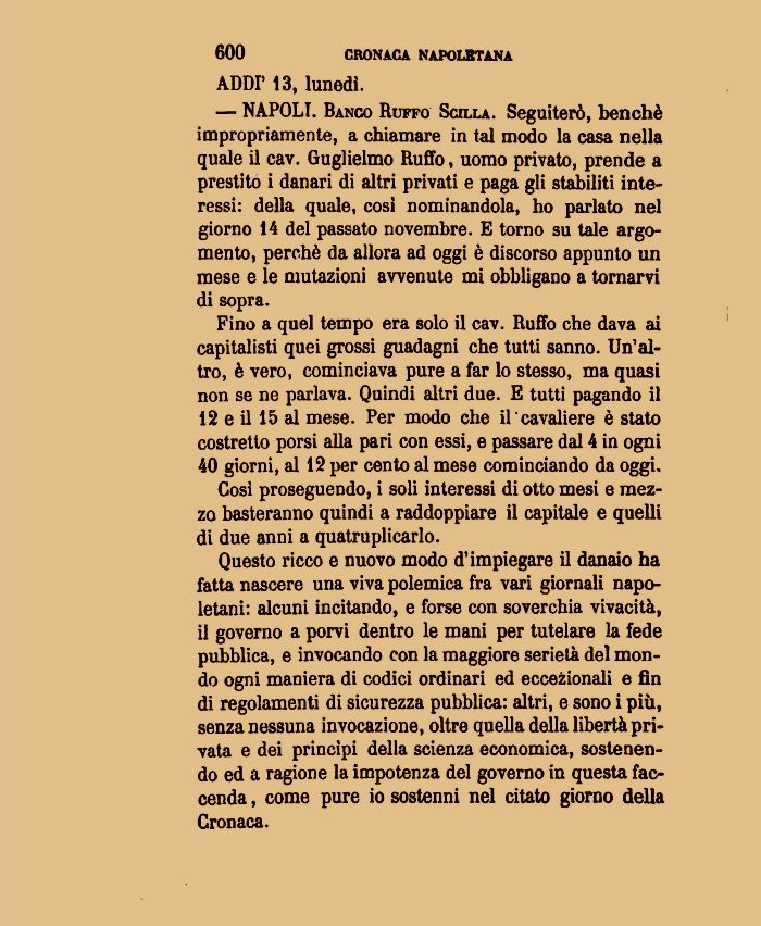 Fino a quel tempo era solo il cav. Ruffo che dava ai capitalisti quei grossi guadagni che tutti sanno. Un'altro, è vero, cominciava pure a far lo stesso, ma quasi non se ne parlava. Quindi altri due. E tutti pagando il 12 e il 15 al mese. Per modo che il cavaliere è stato costretto porsi alla pari con essi, e passare dal 4 in ogni 40 giorni, al 12 per cento al mese cominciando da oggi»