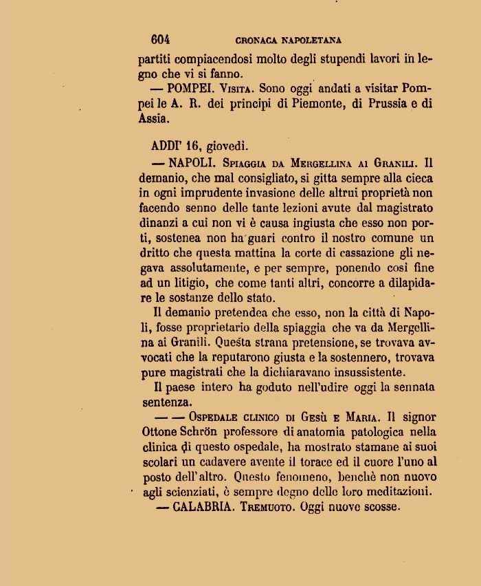 — NAPOLI. Spiaggia da Mergellina ai Granili. Il demanio, che mal consigliato, si gitta sempre alla cieca in ogni imprudente invasione delle altrui proprietà non facendo senno delle tante lezioni avute dal magistrato dinanzi a cui non vi è causa ingiusta che esso non porti, sostenea non ha guari contro il nostro comune un dritto che questa mattina la corte di cassazione gli negava assolutamente, e per sempre, ponendo così fine ad un litigio, che come tanti altri, concorre a dilapidare le sostanze dello stato.