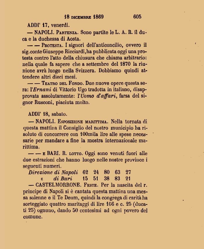 --Teatro del Fondo. Due nuove opere questa sera: l'Emani di Vittorio Ugo tradotta in italiano, disapprovata assolutamente: l'Uomo d'affari, farsa del signor Rusconi, piaciuta molto.