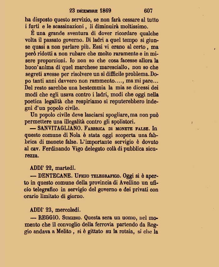 — SANVITAGLIANO. Fabbrica di monete false. In questo comune di Nola è stata oggi scoperta una fabbrica di monete false. L'importante servigio è dovuto al cav. Ferdinando Vigo delegato colà di pubblica sicurezza.