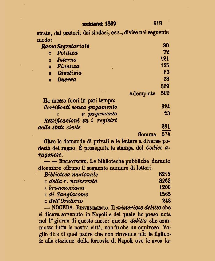 — NOCERA. Rinvenimento. Il misterioso delitto che si diceva avvenuto in Napoli e del quale ho preso nota nel 1° giorno di questo mese: questo delitio che commosse tutta la nostra città, non fu che un equivoco. Voglio dire di quel padre che non rinvenne più le figliuole alla stazione della ferrovia di Napoli ove le avea la-