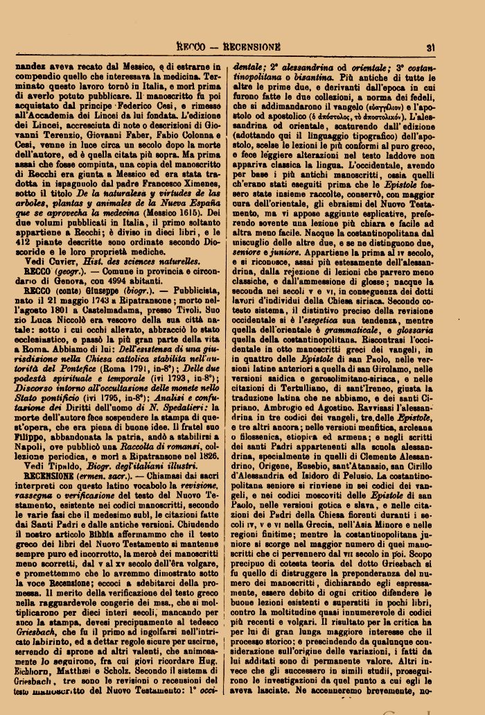 RECENSIONE (ermen. sacr.). — Chiamasi dai sacri interpreti con questo latino vocabolo la revisione, rassegna o verificazione del testo del Nuovo Testamento, esistente nei codici manoscritti, secondo le varie fasi che il medesimo subì, le citazioni fatte dai Santi Padri e dalle antiche versioni. Chiudendo il nostro articolo Bibbia affermammo che il testo greco dei libri del Nuovo Testamento si mantenne sempre puro ed incorrotto, la mercè dei manoscritti meno scorretti, dal v al zv secolo dell'era volgare, e promettemmo che lo avremmo dimostrato sotto la voce Recensione; eccoci a sdebitarci della promessa. 11 merito della verificazione del testo greco nella ragguardevole congerie dei mss., che si moltiplicarono per dieci interi secoli, mancando per , anco la stampa, devesi precipuamente al tedesco Griesbach, che fu il primo ad ingolfarsi nell'intricato labirinto, ed a dettar regole sicure per uscirne, { servendo di sprone ad altri valenti, che animosamente io seguirono, fra cui giovi ricordare Hug, Eichlioro, Matthsei e Scholz. Secondo il sistema di Griesbach, tre sono le revisioni o recensioni del testo nmiiotfcntto del Nuovo Testamento: 1° occi-