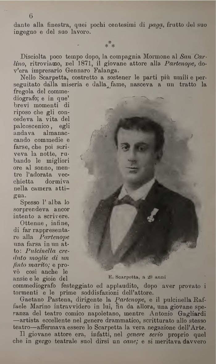 Gaetano Pastena, dirigente la Partenope, e il pulcinella Raffaele Marino intravvidero in lui, fin da allora, una giovane speranza del teatro comico napoletano, mentre Antonio Gagliardi —artista eccellente nel genere drammatico, scritturato allo stesso teatro—affermava essere lo Scarpetta la vera negazione dell'Arte.