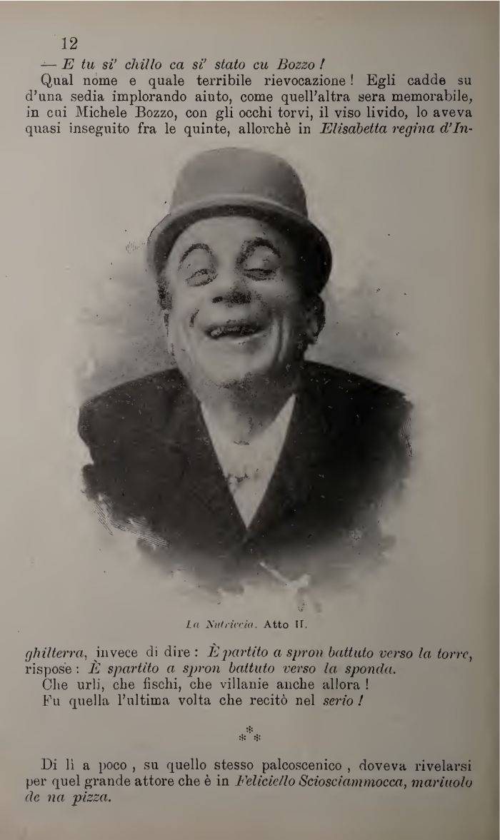 Di lì a poco , su quello stesso palcoscenico , doveva rivelarsi per quel grande attore che è in Felicie/lo Sciascia,mmocca, murinolo de na pizza.