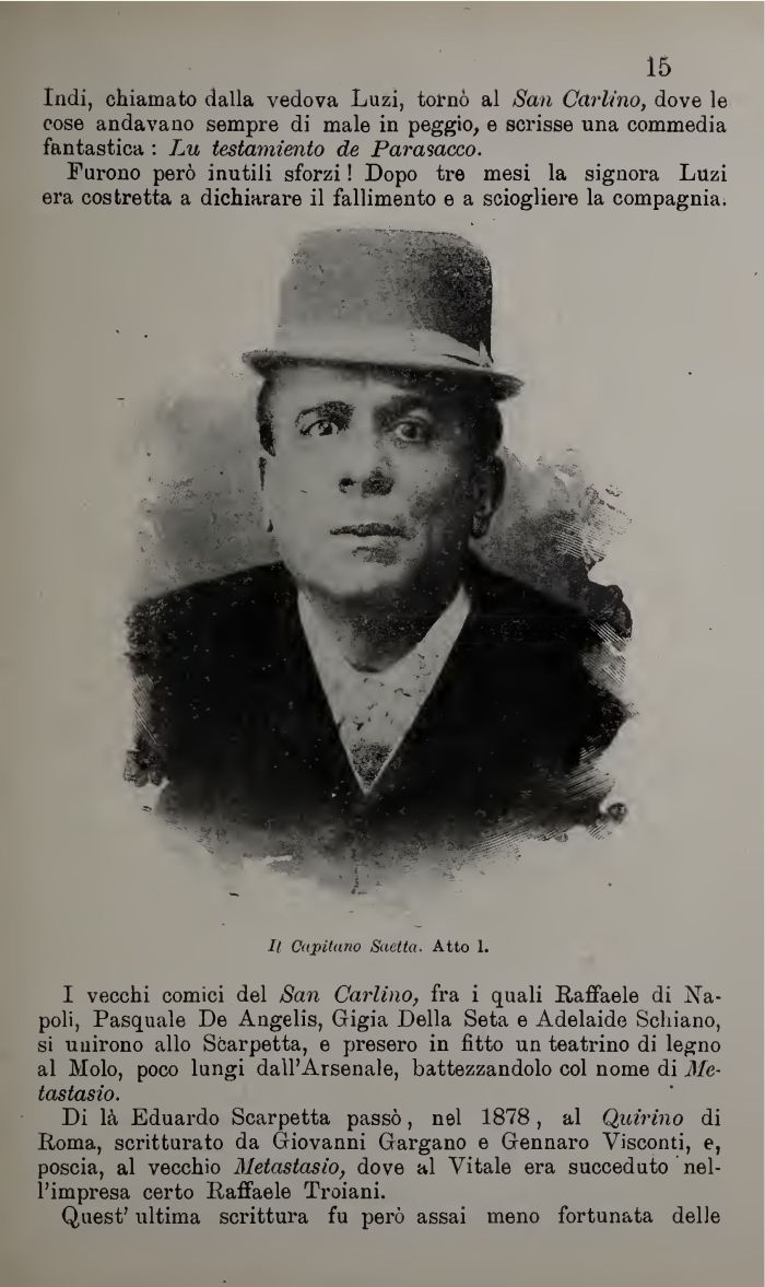 Di là Eduardo Scarpetta pasṣ, nel 1878, al Quirino di Roma, scritturato da Giovanni Gargano e Gennaro Visconti, e, poscia, al vecchio Metastasio, dove al Vitale era succeduto nell'impresa certo Raffaele Troiani.
