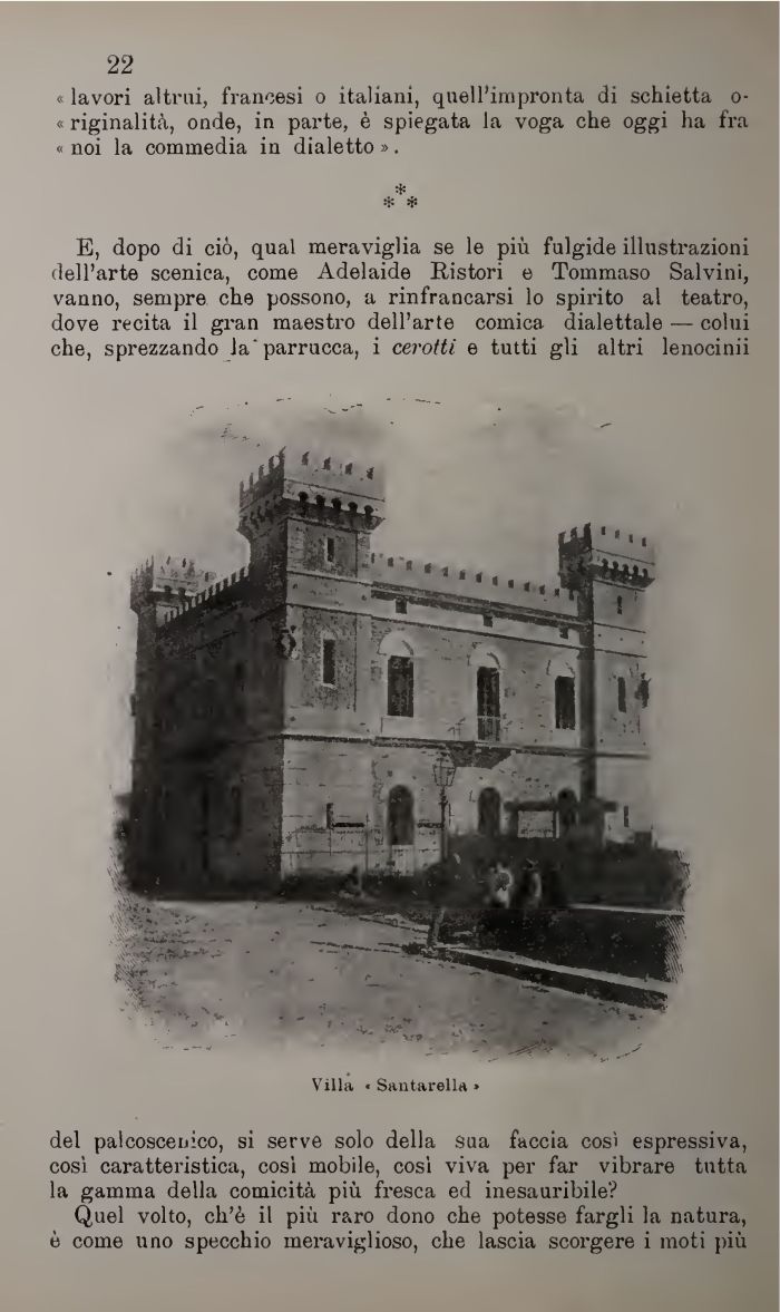 E, dopo di ciò, qual meraviglia se le più fulgide illustrazioni dell'arte scenica, come Adelaide Ristori e Tommaso Salvini, vanno, sempre che possono, a rinfrancarsi lo spirito al teatro, dove recita il gran maestro dell'arte comica dialettale — colui che, sprezzando la' parrucca, i cerotti e tutti gli altri lenocinli