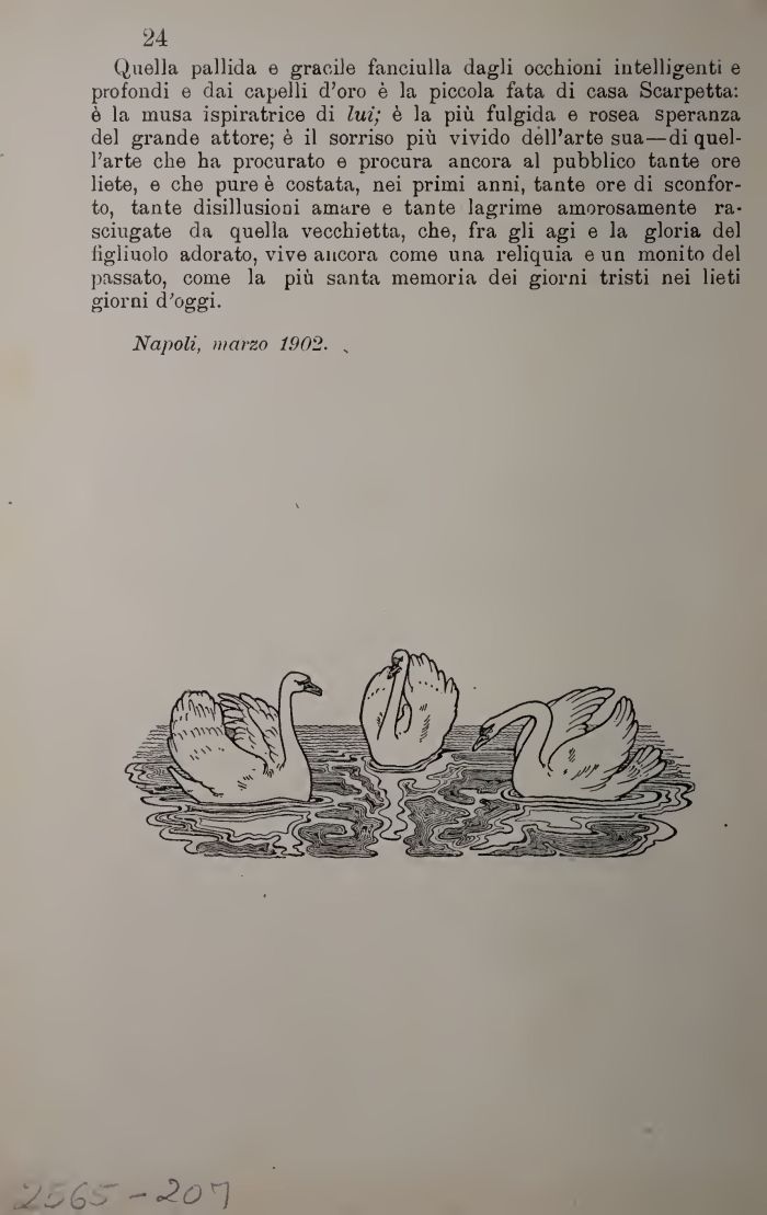 Quella pallida e gracile fanciulla dagli occhioni intelligenti e profondi e dai capelli d'oro è la pìccola fata di casa Scarpetta: è la musa ispiratrice di lui; è la più fulgida e rosea speranza del grande attore; è il sorriso più vivido dell'arte sua—dì quell'arte che ha procurato e procura ancora al pubblico tante ore liete, e che pure è costata, nei primi anni, tante ore di sconforto, tante disillusioni amare e tante lagrime amorosamente rasciugate da quella vecchietta, che, fra gli agi e la gloria del figliuolo adorato, vive ancora come una reliquia e un monito del passato, come la più santa memoria dei giorni tristi nei lieti giorni d'oggi.