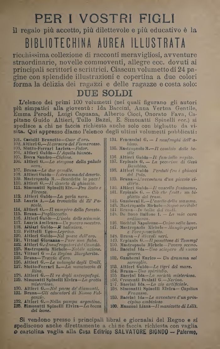 L'elenco dei primi 100 volumetti (nei quali figurano gli autori più simpatici alla gioventù : Ida Baccini, Anna Ver tu a Gentile, Emma Ferodi, Luigi Capuana, Alberto Cioci, Onorato Fava, Capitano Guido Altieri, Tulio Bazzi, E. Simonatti Spinelli per.) si spedisce a chi ne faccia richiesta anche solo con biglietto da visita. Qui appresso diamo l'elenco degli ultimi volumetti pubblicati: