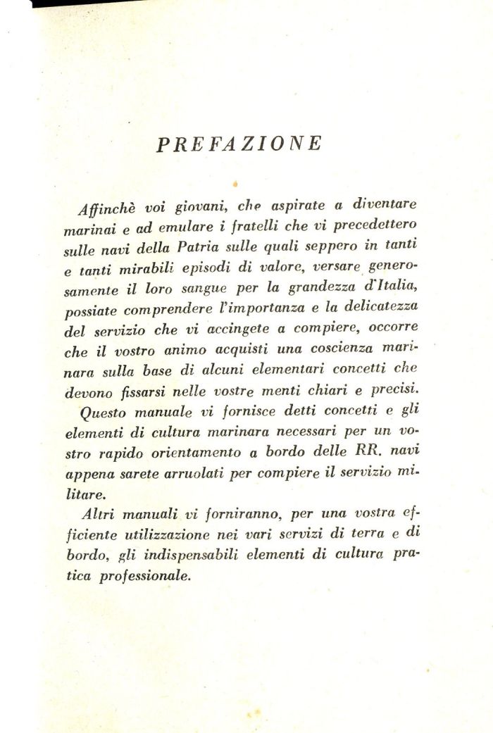 Affinchè voi giovani, che aspirate a diventare marinai e ad emulare i fratelli che vi precedettero sulle navi della Patria sulle quali seppero in tanti e tanti mirabili episodi di valore, versare generosamente il loro sangue per la grandezza d'Italia, possiate comprendere Vimportanza e la delicatezza del servizio che vi accingete a compiere, occorre che il vostro animo acquisti una coscienza marinara sulla base di alcuni elementari concetti che devono fissarsi nelle vostre menti chiari e precisi.