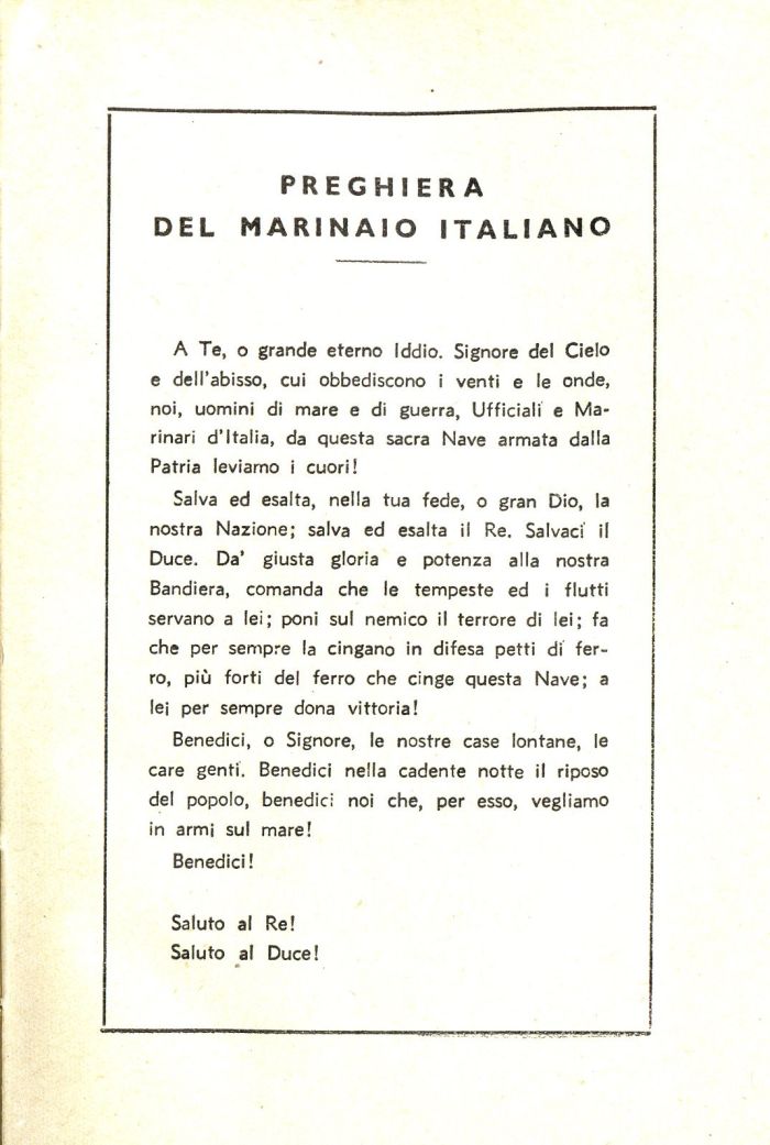 A Te, o grande eterno Iddio. Signore del Cielo e dell'abisso, cui obbediscono i venti e le onde, noi, uomini di mare e di guerra, Ufficiali e Marinari d'Italia, da questa sacra Nave armata dalla Patria leviamo i cuori!