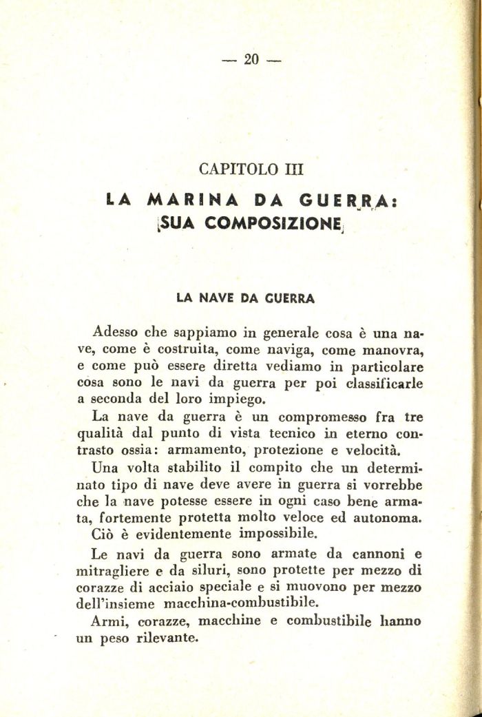 Le navi da guerra sono armate da cannoni e mitragliere e da siluri, sono protette per mezzo di corazze di acciaio speciale e si muovono per mezzo dell'insieme macchina-combustibile.