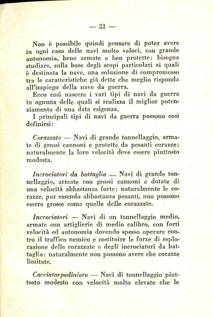 Non è possibile quindi pensare di poter avere in ogni caso delle navi molto veloci, con grande autonomia, bene armate e ben protette: bisogna studiare, sulla base degli scopi particolari ai quali è destinata la nave, una soluzione di compromesso tra le caratteristiche già dette che meglio risponda all'impiego della nave da guerra.