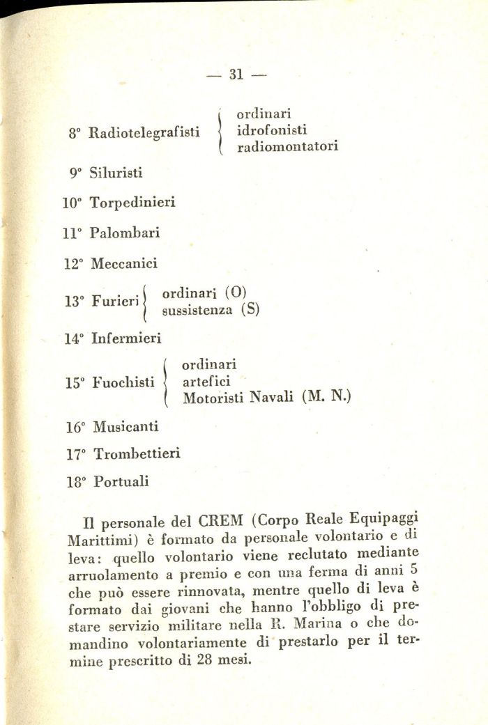 Il personale del CREM (Corpo Reale Equipaggi Marittimi) è formato da personale volontario e di leva: quello volontario viene reclutato mediante arruolamento a premio e con una ferma di anni 5 che può essere rinnovata, mentre quello di leva è formato dai giovani che hanno l'obbligo di prestare servizio militare nella R. Marina o che domandino volontariamente di prestarlo per il termine prescritto di 28 mesi.