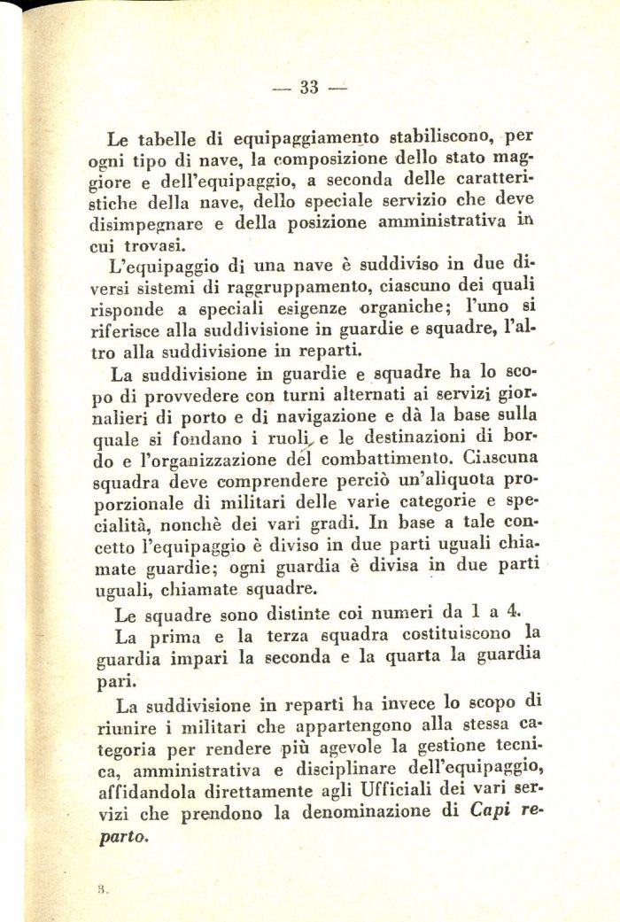 La suddivisione in guardie e squadre ha lo scopo di provvedere con turni alternati ai servizi giornalieri di porto e di navigazione e dà la base sulla quale si fondano i ruoli,, e le destinazioni di bordo e l'organizzazione del combattimento. Ciascuna squadra deve comprendere perciò un'aliquota proporzionale di militari delle varie categorie e specialità, nonché dei vari gradi. In base a tale concetto l'equipaggio è diviso in due parti uguali chiamate guardie; ogni guardia è divisa in due parti uguali, chiamate squadre.