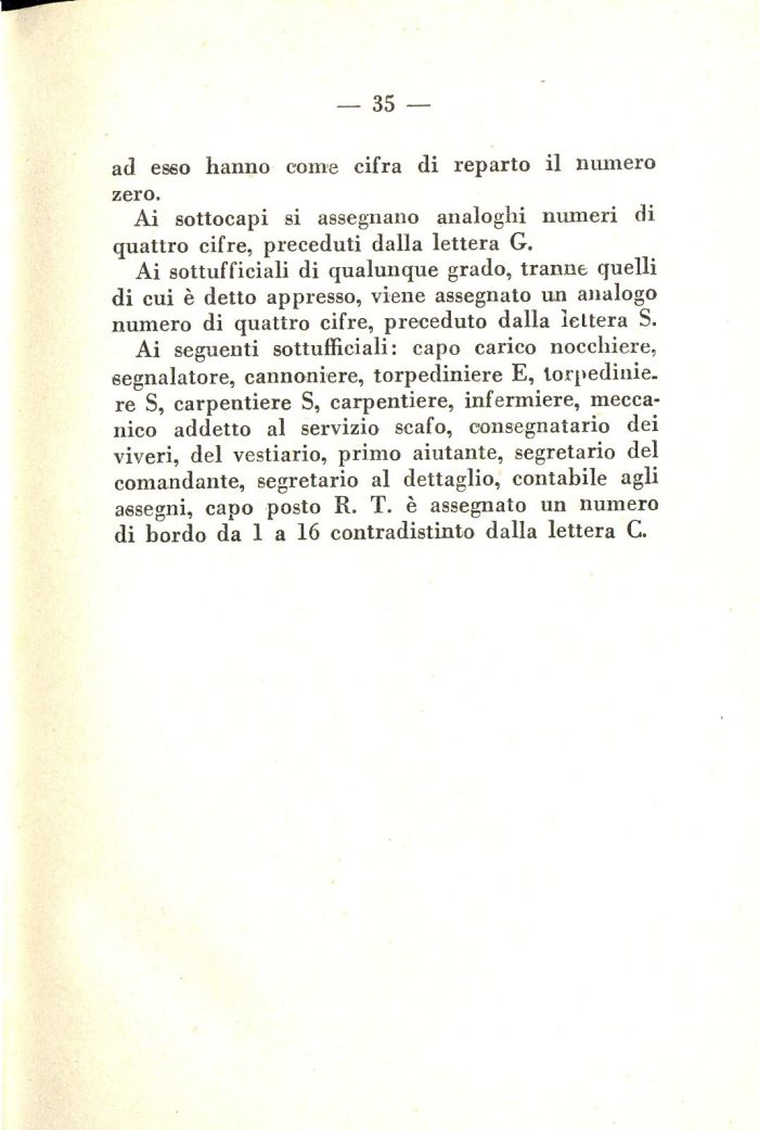 Ai seguenti sottufficiali: capo carico nocchiere, segnalatore, cannoniere, torpediniere E, torpediniere S, carpentiere S, carpentiere, infermiere, meccanico addetto al servizio scafo, consegnatario dei viveri, del vestiario, primo aiutante, segretario del comandante, segretario al dettaglio, contabile agli assegni, capo posto R. T. è assegnato un numero di bordo da 1 a 16 contradistinto dalla lettera C.
