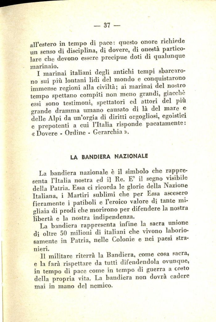 La bandiera nazionale è il simbolo che rappresenta l'Italia nostra ed il Re. E' il segno visibile della Patria. Essa ci ricorda le glorie della Nazione Italiana, i Martiri sublimi che per Essa ascesero fieramente i patiboli e l'eroico valore di tante migliaia di prodi che morirono per difendere la nostra libertà e la nostra indipendenza.