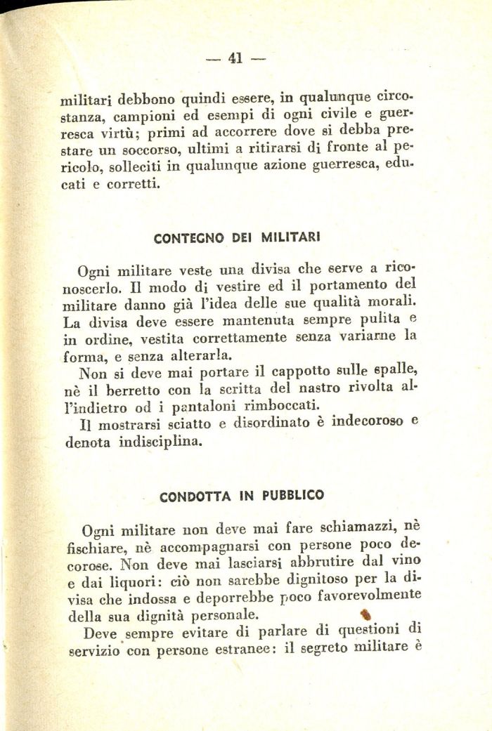 Ogni militare non deve mai fare schiamazzi, nè fischiare, nè accompagnarsi con persone poco decorose. Non deve mai lasciarsi abbrutire dal vino e dai liquori: ciò non sarebbe dignitoso per la divisa che indossa e deporrebbe poco favorevolmente della sua dignità personale. %