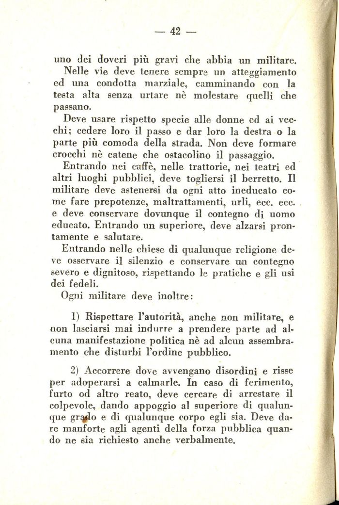 Entrando nei caffč, nelle trattorie, nei teatri ed altri luoghi pubblici, deve togliersi il berretto. Il militare deve astenersi da ogni atto ineducato come fare prepotenze, maltrattamenti, urli, ecc. ecc. e deve conservare dovunque il contegno di uomo educato. Entrando un superiore, deve alzarsi prontamente e salutare.