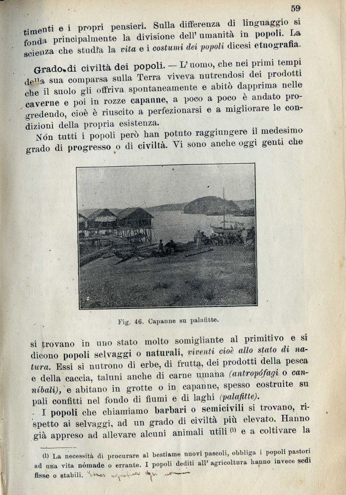 Grado.di civiltà dei popoli. — L'uomo, che nei primi tempi ile11»' sua comparsa sulla Terra viveva nutrendosi dei prodotti che il suolo gli offriva spontaneamente e abitò dapprima nelle caverne e poi in rozze capanne, a poco a poco è andato progredendo, cioè è riuscito a perfezionarsi e a migliorare le condizioni della propria esistenza.