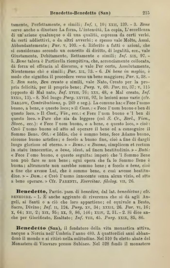 tamente, Perfettamente, e simili; Inf. i, 10; xxii, 139. - 3. Bene serve anche a dinotare La forza, L'intensità, La copia, L'eccellenza di un'azione qualunque o di una qualità, espressa da certi verbi, da certi addiettivi, o da altri avverbi; e spesso vale Molto, Assai, Abbondantemente ; Par. v, 103. - 4. Riferito a fatti o azioni, che si considerano secondo un concetto di diritto, di legalità, ecc., vale Giustamente, Debitamente, Rettamente e simili; Inf. xix, 97. -5. Bene talora è Particella riempitiva, che, acconciamente collocata, dà forza ed efficacia al discorso, e vale Per certo, Assolutamente, Nientemeno chè e simili ; Par. xii, 73. - 6. Di bene in meglio, è modo che significa il procedere verso un bene maggiore; Par. x, 38. -7. Ben nato, Ben ereato e simili, vale Nato, Creato per la propria felicità, per il proprio bene; Purg. v, 60. Par. in, 37; V, 115 (opposto di Mal nato, Inf. xvm, 76; xxx, 48, e Mal creato, Inf. xxxn, 13).-8. Nel luogo Purg. xxviii, 92, le lezioni sono varie (cfr. Barlow, Contributions, p. 269 e seg.). La comune ha:«Fece l'uomo buono, a bene, e questo loco; » il Cass. : « Fece l'uom buono e ben di questo loco. » Il Caet., Viv., ecc.: « Fece l'uom buono e '1 ben di questo loco. » Pare che sia da leggere (col S. Cr., Beri., Vien., Stoec., ecc.): « Fece l'uom buono, e a bene, e questo loco, » cioè: Creò l'uomo buono ed atto ad operare il bene ed a conseguire il Sommo Bene. Ott.: « Iddio, che è sommo bene, fece Adamo buono, siccome buono artefice ; e fecelo a buono fine, cioè a fine di dargli luogo glorioso ed eterno. » - Benv.: « Buono, simplicem et recturn in statu innocenti®, a bene, idest, ad finem beatitudinis. » - Buti: « Fece l'omo buono, e questo seguita: imperò che '1 Sommo Bene non può fare se non bene ; ogni opera che fa lo Sommo Bene è buona ; altramente non sarebbe sommo bene ; e fecelo a bene, cioè a fine che avesse Lui, che è sommo bene, e così avesse beatitudine. » - Dan.: « Creò l'uomo innocente senza alcun vizio, ed atto a bene operare. » Cfr. Parenti, Esercitaz. filolog. vii, 26.
