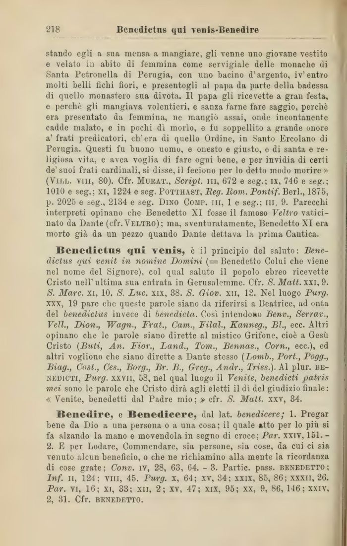 Benedictus qui venis, è il principio del saluto: Benedictus qui venit in nomine Domini (= Benedetto Colui che viene nel nome del Signore), col qual saluto il popolo ebreo ricevette Cristo nell'ultima sua entrata in Gerusalemme. Cfr. S. Matt. xxi, 9. S. Marc, xi, 10. S. Lue. xix, 38. S. Giov. xii, 13. Nel luogo Purg. xxx, 19 pare che queste parole siano da riferirsi a Beatrice, ad onta del benedictus invece di benedicta. Così intendono Benv., Serrav., Veli., Dion., Wagn., Frat., Cam., Filai., Kanneg., Bl., ecc. Altri opinano che le parole siano dirette al mistico Grifone, cioè a Gesù Cristo (Buti, An. Fior., Land., Tom., Bennas., Com., ecc.), ed altri vogliono che siano dirette a Dante stesso (Lomb., Port., Pogg., Biag., Cast., Ces., Borg., Br. B., Greg., Andr., Triss.). Al plur. benedìciti, Purg. xxvil, 58, nel qual luogo il Venite, benedicti patris mei sono le parole che Cristo dirà agli eletti il dì del giudizio finale: « Venite, benedetti dal Padre mio ; » cfr. S. Matt. xxv, 34.