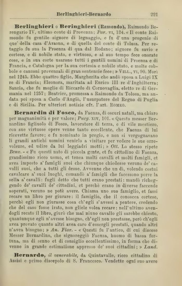 Berlinghi eri o Beringhieri (Ramondo), Raimondo Berengario IV, ultimo conte di Provenza; Par. vi, 134. «Il conte Raimondo fu gentile signore di legnaggio, e fu d'una progenie di que' della casa d'Araona, e di quella del conte di Tolosa. Per retaggio fu sua la Proenza di qua dal Rodano; signore fu savio e cortese, e di nobile stato, e virtuoso, e al suo tempo fece onorate cose, e in sua corte usarono tutti i gentili uomini di Proenza e di Francia, e Catalogna per la sua cortesia e nobile stato, e molte cob-bole e canzoni provenzali di gran sentenzie fece ; » Vill., vi, 90. Morì nel 1245. Ebbe quattro figlie, Margherita che andò sposa a Luigi IX re di Francia; Eleonora, maritata ad Enrico III re d'Inghilterra; Sanzia, che fu moglie di Riccardo di Cornovaglia, eletto re di Germania nel 1257; Beatrice, promessa a Raimondo da Tolosa, ma andata poi sposa a Carlo d'Angiò, l'usurpatore del Regno di Puglia e di Sicilia. Per ulteriori notizie cfr. 1' art. Romeo.