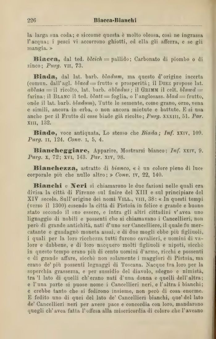 Bianchi e Neri si chiamarono le due fazioni nelle quali era divisa la città di Firenze sul finire del XIII e sul principiare del XIV secolo. Sull'origine dei nomi Vill., viii, 38: « In questi tempi (verso il 1300) essendo la città di Pistoia in felice e grande e buono stato secondo il suo essere, e intra gli altri cittadini v'avea uno lignaggio di nobili e possenti che si chiamavano i Cancellieri, non però di grande antichità, nati d'uno ser Cancelliere, il quale fu mercatante e guadagnò moneta assai, e di due mogli ebbe più figliuoli, i quali per la loro ricchezza tutti furono cavalieri, e uomini di valore e dabbene, e di loro nacquero molti figliuoli e nipoti, sicché in questo tempo erano più di cento uomini d'arme, ricchi e possenti e di grande affare, sicché non solamente i maggiori di Pistoia, ma erano de' più possenti legnaggi di Toscana. Nacque tra loro per la soperchia grassezza, e per sussidio del diavolo, sdegno e nimistà, tra'1 lato di quelli ch'erano nati d'una donna e quelli dell'altra; e l'una parte si puose nome i Cancellieri neri, e l'altra i bianchi; e crebbe tanto che si fedirono insieme, non però di cosa enorme. E fedito uno di quei del lato de' Cancellieri bianchi, que' del lato de' Cancellieri neri per avere pace e concordia con loro, mandarono quegli eh' avea fatta 1' offesa alla misericordia di coloro .che l'aveano