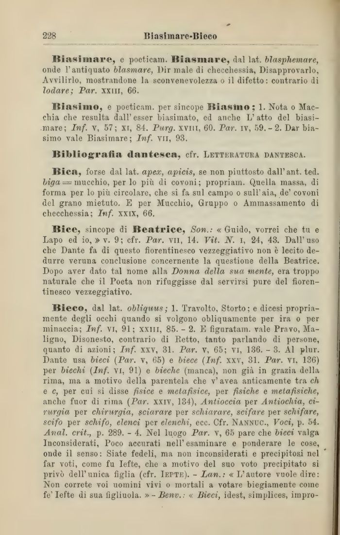 Bieco, dal lat. obliquus; 1. Travolto, Storto; e dicesi propriamente degli occhi quando si volgono obliquamente per ira o per minaccia; Inf. vi, 91; xxiii, 85. - 2. E figuratam. vale Pravo, Maligno, Disonesto, contrario di Retto, tanto parlando di persone, quanto di azioni; Inf. xxv, 31. Par. V, 65; vi, 136. - 3. Al plur. Dante usa bieci (Par. v, 65) e biece (Inf. xxv, 31. Par. vi, 136) per biechi (Inf. vi, 91) e bieche (manca), non già in grazia della rima, ma a motivo della parentela che v' avea anticamente tra eh e c, per cui si disse fisice e metafisice, per fisiche e metafisiche, anche fuor di rima (Par. xxiv, 134), Antioccia per Antiochia, ci-rurgia per chirurgia, sciarare per schiarare, scifare per schifare, scifo per schifo, elenci per elenchi, ecc. Cfr. Nannuc., Voci, p. 54. Anal. crit., p. 289. - 4. Nel luogo Par. v, 65 pare che bieci valga Inconsiderati, Poco accurati nell'esaminare e ponderare le cose, onde il senso: Siate fedeli, ma non inconsiderati e precipitosi nel far voti, come fu Iefte, che a motivo del suo voto precipitato si privò dell'unica figlia (cfr. Iepte). - Lan.: « L'autore vuole dire: Non correte voi uomini vivi o mortali a votare biegiamente come fe' Iefte di sua figliuola. » - Benv.: « Bieci, idest, simplices, irnpro-