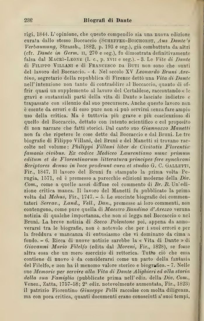 rigi, 1844. L'opinione, che questo compendio sia una nuova edizione curata dallo stesso Boccaccio (Scheffer-Boichorst, Aus Dante's Verbaunung, Strassb., 1882, p. 193 e seg.), già combattuta da altri (cfr. Dante in Germ. u, 270 e seg.), fu dimostrata definitivamente falsa dal MACRÌ-LEONE (1. c., p. xvn e seg.). - 3. Le Vite di Dante di Filippo Villani e di Francesco da Buti non sono che sunti del lavoro del Boccaccio. - 4. Nel secolo XV Leonardo Bruni Aretino, segretario della repubblica di Firenze dettò una Vita di Dante nell'intenzione non tanto di contraddire al Boccaccio, quanto di offrir quasi un supplemento al lavoro del Certaldese, raccontando « le gravi e sustanziali parti della vita di Dante » lasciate indietro e trapassate con silenzio dal suo precursore. Anche questo lavoro non è esente da errori e di esso pure non si può servirsi senza fare ampio uso della critica. Ma è tuttavia più grave e più coscienzioso di quello del Boccaccio, dettato con intento scientifico e col proposito di non narrare che fatti storici. Dal canto suo Gìannozzo Manetti non fa che ripetere le cose dette dal Boccaccio e dal Bruni. Le tre biografie di Filippo Villani, del Bruni e del Manetti si trovano raccolte nel volume : Pliilippi Villani liber de Civitatis Fiorentine famosis civibus. Ex codice Mediceo Laurentiano nunc primum editum et de Florentinorum litteratura principes fere synchroni Scriptores denuo in luce prodeunt cura et studio G. C. Galletti, Fir., 1847. Il lavoro del Bruni fu stampato la prima volta Perugia, 1571, ed è premesso a parecchie edizioni moderne della Div. Coìti., come a quelle assai diffuse col commento di Br. B. Un'edizione critica manca. Il lavoro del Manetti fu pubblicato la prima volta dal Mehus, Fir., 1747. - 5. Le succinte biografie dei commentatori Serrav., Land., Veli., Dan., premesse ai loro commenti, non contengono, come pure quella di Maestro Bandino d'Arezzo veruna notizia di qualche importanza, che non si legga nel Boccaccio o nel Bruni. La breve notizia di Secco Polentone poi, appena da annoverarsi tra le biografie, non è notevole che per i suoi errori e per la freddura e mancanza di entusiasmo che vi dominano da cima a fondo. - 6. Eicca di nuove notizie sarebbe la « Vita di Dante » di Giovanni Mario Filelfo (edita dal Moreni, Fir., 1828), se fosse altra eosa che un mero esercizio di rettorica. Tutto ciò che essa contiene di nuovo è da considerarsi come un parto della fantasia del Filelfo, e non ha il menomo valore storico e biografico. - 7. Nelle sue Memorie per servire alla Vita di Dante Alighieri ed alla storia della sua Famiglia (pubblicate prima nell' ediz. della Div. Com., Venez., Zatta, 1757-58; 2a ediz. notevolmente aumentata, Fir., 1823) il patrizio Fiorentino Giuseppe Pelli raccolse con molta diligenza, ma con poca critica, quanti documenti erano conosciuti a'suoi tempi,