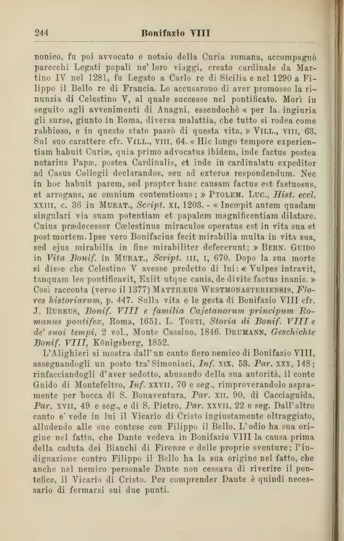 nonico, fu poi avvocato e notaio della Curia romana, accompagnò parecchi Legati papali ne' loro viaggi, creato cardinale da Martino IV nel 1281, fu Legato a Carlo re di Sicilia e nel 1290 a Filippo il Bello re di Francia. Lo accusarono di aver promosso la rinunzia di Celestino V, al quale successe nel pontificato. Morì in seguito agli avvenimenti di Anagni, essendoché « per la. ingiuria gli surse, giunto in Roma, diversa malattia, che tutto si rodea come rabbioso, e in questo stato passò di questa vita, » Vill., viit, 63. Sul suo carattere cfr. Vill., viti, 64. « Hic longo tempore experien-tiam habuit Curise, quia primo advocatus ibidem, inde factus postea notarius Papse, postea Cardinalis, et inde in cardinalatu expeditor ad Casus Collegii declarandos, seu ad exteros respondendum. Nec in hoc habuit parem, sed propter hanc causam factus est fastuosus, et arrogans, ac omnium contemtiosus ; » Ptolem. Lue., Hist. eccl. xxm, c. 36 in Murat., Script. xi, 1203. - « Inccepit autem quadam singulari via suam potentiam et papalem magnificentiam dilatare. Cuius prsedecessor Ccelestinus miraculos operatus est in vita sua et post mortem. Ipse vero Bonifacius fecit mirabilia multa in vita sua, sed ejus mirabilia in fine mirabiliter defecerunt; » Bern. Guido in Vita Bonif. in Murat., Script, ni, i, 670. Dopo la sua morte si disse che Celestino V avesse predetto di lui:«Vulpes intravit, tanquam leo pontificavit, Exiit utque canis, de di vite factus inanis. » Così racconta (verso il 1377) Mattii/EUS Westmonasteriensis, Flores liistoriarum, p. 447. Sulla vita e le gesta di Bonifazio VIII cfr. J. Rubeus, Bonif. Vili e familia Cajetanorum principimi Bo-manus pontifex, Roma, 1651. L. Tosti, Storia di Bonif. Vili e de' suoi tempi, 2 voi., Monte Cassino, 1846. Drumann, Ge'schiclite Bonif. Vili, Konigsberg, 1852.