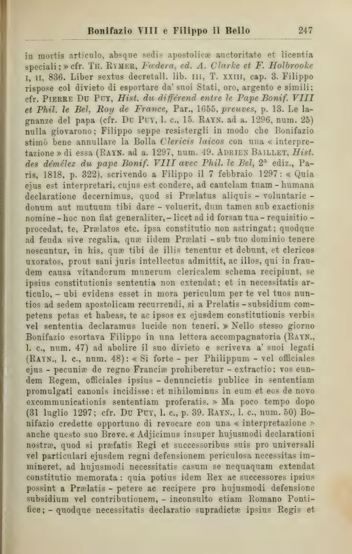 in mortis articulo, absque sedis apostoliche auctoritate et licentia speciali ;» cfr. Tn. Rymer, Feeder a, ed. A. Clarice et F. Holbrooke i, il, 836. Liber sextus decretali, lib. ni, T. xxiii, cap. 3. Filippo rispose col divieto di esportare da' suoi Stati, oro, argento e simili; cfr. Pierre Dd Puy, Hist. du differend entre le Pape Bonif. Vili et Phil. le Bel, Boy de France, Par., 1655, preuves, p. 13. Le lagnanze del papa (cfr. Du Puy, 1. c., 15. Rayn. ad a. 1296, nuin. 25) nulla giovarono; Filippo seppe resistergli in modo che Bonifazio stimò bene annullare la Bolla Clericis laicos con una « interpretazione » di essa (eayn. ad a. 1297, num. 49. Adrien Baillet, Hist. des démélez du pape Bonif. Vili avec Phil. le Bel, 2a ediz., Paris, 1818, p. 322), scrivendo a Filippo il 7 febbraio 1297: « Quia ejus est interpretari, cujus est condere, ad cautelam tuam-humana declaratione decernimus, quod si Pralatus aliquis - voluntarie -donum aut mutuum tibi dare - voluerit, dum tamen sub exactionis nomine-hoc non fiat generaliter,-licet ad id forsan tua-requisitio -procedat, te, Prselatos etc. ipsa constitutio non astringat; quodque ad feuda sive regalia, quse iidem Prselati - sub tuo dominio tenere noscuntur, in his, quse tibi de illis tenentur et debunt, et clericos uxoratos, prout sani juris intellectus admittit, ac illos, qui in frau-dem causa vitandorum munerum clericalem schema recipiunt, se ipsius constitutionis sententia non extendat: et in necessitatis articulo, - ubi evidens esset in mora periculum per te vel tuos nun-tios ad sedem apostolicam recurrendi, si a Prelatis - subsidium com-petens petas et habeas, te ac ipsos ex ejusdem constitutionis verbis vel sententia declaramus lucide non teneri. » Nello stesso giorno Bonifazio esortava Filippo in una lettera accompagnatoria (Rayn., 1. c., num. 47) ad abolire il suo divieto e scriveva a' suoi legati (Rayn., 1. c., num. 48): « Si forte - per Philippum - vel oificiales ejus - pecunise de regno Francise prohiberetur - extractio; vos eun-dem Regem, officiales ipsius - denuncietis publice in sententiam promulgati canonis incidisse: et nihilominus in eum et eos de novo excommunicationis sententiam proferatis. » Ma poco tempo dopo (31 luglio 1297; cfr. Du Puy, 1. c., p. 39. rayn., 1. c., num. 50) Bonifazio credette opportuno di revocare con una « interpretazione >•> anche questo suo Breve. « Adjicimus insuper hujusinodi declarationi nostrae, quod si pra?fatis Regi et successoribus suis prò universali vel particulari ejusdem regni defensionem periculosa necessitas im-mineret, ad hujusmodi necessitatis casum se nequaquam extendat constitutio memorata : quia potius idem Rex ac successores ipsius possint a Praelatis - petere ac recipere prò hujusmodi defensione subsidium vel contributionem, - inconsulto etiam Romano Ponti-fice;- quodque necessitatis declaratio supradietse ipsius Regis et