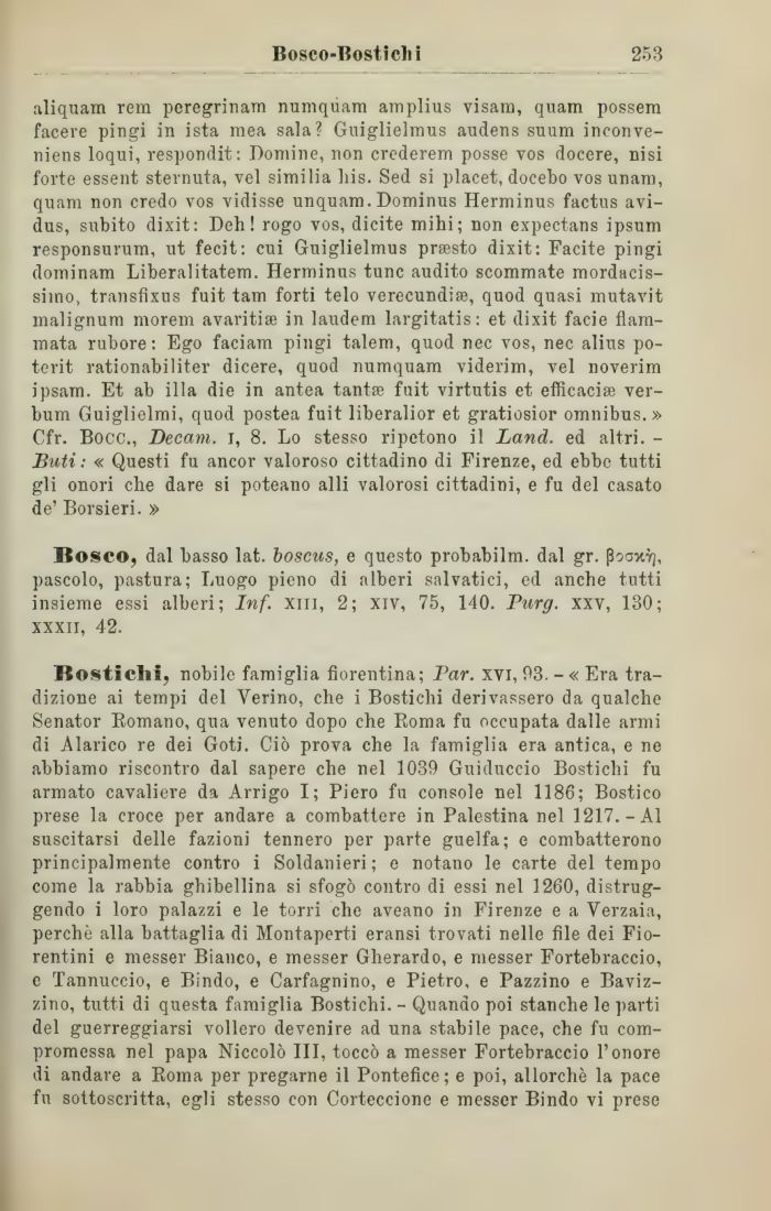TSosticlii, nobile famiglia fiorentina; Par. xvi, 03. - « Era tradizione ai tempi del Verino, che i Bosticlii derivassero da qualche Senator Romano, qua venuto dopo che Roma fu occupata dalle armi di Alarico re dei Goti. Ciò prova che la famiglia era antica, e ne abbiamo riscontro dal sapere che nel 1039 Guiduccio Bostichi fu armato cavaliere da Arrigo I; Piero fu console nel 1186; Bostico prese la croce per andare a combattere in Palestina nel 1217.-Al suscitarsi delle fazioni tennero per parte guelfa; e combatterono principalmente contro i Soldanieri ; e notano le carte del tempo come la rabbia ghibellina si sfogò contro di essi nel 1260, distruggendo i loro palazzi e le torri che aveano in Firenze e a Verzaia, perchè alla battaglia di Montaperti eransi trovati nelle file dei Fiorentini e messer Bianco, e messer Gherardo, e messer Fortebraccio, e Tannuccio, e Bindo, e Carfagnino, e Pietro, e Pazzino e Baviz-zino, tutti di questa famiglia Bostichi. - Quando poi stanche le parti del guerreggiarsi vollero devenire ad una stabile pace, che fu compromessa nel papa Niccolò III, toccò a messer Fortebraccio l'onore di andare a Roma per pregarne il Pontefice; e poi, allorché la pace fu sottoscritta, egli stesso con Corteccione e messer Bindo vi prese