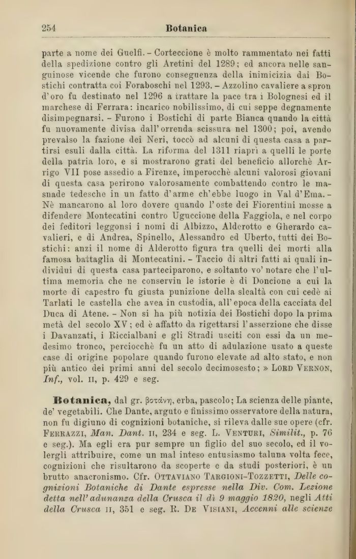 Botanica, dal gr. poxdvy], erba, pascolo; La scienza delle piante, de' vegetabili. Che Dante, arguto e finissimo osservatore della natura, non fu digiuno di cognizioni botaniche, si rileva dalle sue opere (cfr. Ferrazzi, Man. Dant. li, 234 e seg. L. Venturi, Similit., p. 76 e seg.). Ma egli era pur sempre un figlio del suo secolo, ed il volergli attribuire, come un mal inteso entusiasmo taluna volta fece, cognizioni che risultarono da scoperte e da studi posteriori, è un brutto anacronismo. Cfr. Ottaviano Targioni-Tozzetti, Delle cognizioni Botaniche di Dante espresse nella Div. Corri. Lezione detta nelV adunanza della Crusca il dì 9 maggio 1820, negli Atti della Crusca il, 351 e seg. R. De Visiani, Accenni alle scienze