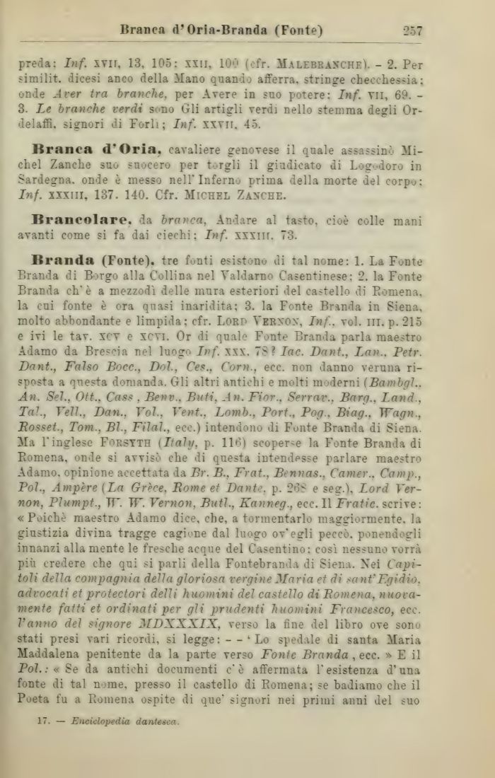 Branda (Fonte), tre fonti esistono di tal nome: 1. La Fonte Branda di Borgo alla Collina nel Yaldarno Casentinese; 2. la Fonte Branda eh' è a mezzodì delle mura esteriori del castello di Romena, la cui fonte è ora quasi inaridita; 3. la Fonte Branda in Siena, molto abbondante e limpida; cfr. Lord Yernon, Inf.. voi. ili. p. 215 e ivi le tav. xcv e xcvi. Or di quale Fonte Branda parla maestro Adamo da Brescia nel luogo Inf. xxx. 78? Iac. Dant., Lan.. Petr. Dant., Falso Bocc., Dot, Ce?., Com., ecc. non danno veruna risposta a questa domanda. Gli altri antichi e molti moderni (Bambgl.. An. Sei., Ott.. Cass , Benv.. Buti, An. Fior., Serrar., Barg., land., Tal., Veli., Dan., Voi, Veni., Lomb., Port., Pog.. Biag.. Wagn., Bosset., Tom.. Bl. Filai, ecc.) intendono di Fonte Branda di Siena. Ma l'inglese Fop.stth (Itali/, p. 116) scoperse la Fonte Branda di Romena, onde si avvisò che di questa internasse parlare maestro Adamo, opinione accettata da Br. B.. Frat., Bennas.. Corner.. Camp., Poi, Ampère (La Grece, Rome et Dante, p. 26S e seg.ì, Lord Ver-non, Plumpt., IT. TF. Vernon, Buti, Kanneg., ecc. Il Fratic. scrive: «Poiché maestro Adamo dice, che, a tormentarlo maggiormente, la giustizia divina tragge cagione dal luogo ov'egli peccò, ponendogli innanzi altamente le fresche acque del Casentino: così nessuno vorrà più credere che qui si parli della Fontebranda di Siena. Nei Capitoli della compagnia della gloriosa vergine Maria et di sant'Egidio, advocati et protectori delli huomini del castello di Bomena, nuovamente fatti et ordinati per gli prudenti huomini Francesco, ecc. Vanno del signore MDXXXIX, verso la fine del libro ove sono stati presi vari ricordi, si legge: — 'Lo spedale di santa Maria Maddalena penitente da la parte verso Fonie Branda , ecc. » E il Poi : « Se da antichi documenti c'è affermata l'esistenza d'una fonte di tal nome, presso il castello di Romena; se badiamo che il Poeta fu a Romena ospite di que' signori nei primi anni del suo