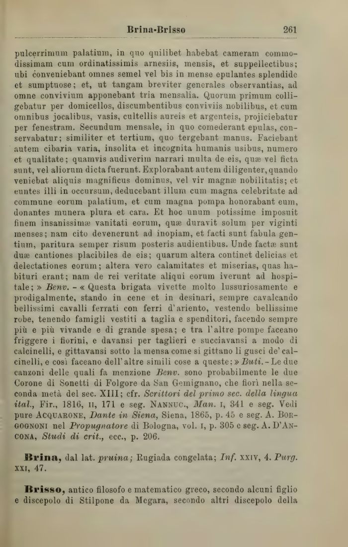 pulcerrimum palatium, in quo quilibet habebat cameram comino-dissimam cum ordinatissimis arnesiis, mensis, et suppellectibus; ubi conveniebant omnes semel vel bis in mense epulantes splendide et sumptuose; et, ut tangam breviter generales observantias, ad omne convivium apponebant tria mensalia. Quorum primum colli-gebatur per domicellos, discumbentibus conviviis nobilibus, et cum omnibus jocalibus, vasis, cultellis aureis et argenteis, projiciebatur per fenestram. Secundum mensale, in quo comederant epulas, con-servabatur; similiter et tertium, quo tergebant manus. Faciebant autem cibaria varia, insolita et incognita humanis usibus, numero et qualitate; quamvis audiverim narrari multa de eis, quse vel ficta sunt, vel aliorum dieta fuerunt. Explorabant autem diligenter, quando veniebat aliquis magnificus dominus, vel vir magnse nobilitatis; et euntes il 1 i in occursum, deducebant illum cum magna celebritate ad commune eorum palatium, et cum magna pompa honorabant eum, donantes munera plura et cara. Et hoc unum potissime imposuit finem insanissimo vanitati eorum, quse duravit solum per viginti menses; nam cito devenerunt ad inopiam, et facti sunt fabula gen-tiuin, paritura semper risum posteris audientibus. Unde faetse sunt duse cantiones placibiles de eis; quarum altera continet delicias et delectationes eorum; altera vero calamitates et miserias, quas ha-bituri erant; nam de rei ventate aliqui eorum iverunt ad hospi-tale ;» Benv. -« Questa brigata vivette molto lussuriosamente e prodigalmente, stando in cene et in desinari, sempre cavalcando bellissimi cavalli ferrati con ferri d'ariento, vestendo bellissime robe, tenendo famigli vestiti a taglia e spenditori, facendo sempre più e più vivande e di grande spesa; e tra l'altre pompe faceano friggere i fiorini, e davansi per taglieri e succiavansi a modo di calcinelli, e gittavansi sotto la mensa come si gittano li gusci de'calcinelli, e così faceano dell'altre simili cose a queste: » Buti.- Le due canzoni delle quali fa menzione Benv. sono probabilmente le due Corone di Sonetti di Folgore da San Gemignano, che fiorì nella seconda metà del sec. XIII ; cfr. Scrittori del primo sec. della lingua ital., Fir., 1816, il, 171 e seg. Nannuc., Man. i, 341 e seg. Vedi pure Acquarone, Dante in Siena, Siena, 1865, p. 45 e seg. A. Borgognoni nel Propugnatore di Bologna, voi. i, p. 305 e seg. A. D'Ancona, Studi di erit., ecc., p. 206.