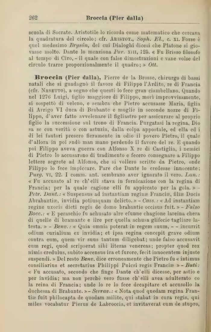 Broccia (Pier dalla), Pierre de la Brosse, chirurgo di bassi natali che si guadagnò il favore di Filippo l'Ardito, re di Francia (cfr. Nasetto), a segno che questi lo fece gran ciambellano. Quando nel 1276 Luigi, figlio maggiore di Filippo, morì improvvisamente, si sospettò di veleno, e sembra che Pietro accusasse Maria, figlia di Arrigo VI duca di Brabante e moglie in seconde nozze di Filippo, d'aver fatto avvelenare il figliastro per assicurare al proprio figlio la successione sul trono di Francia. Purgatasi la regina, Dio sa se con verità o con astuzia, dalla colpa appostale, ed ella ed i di lei fautori presero fieramente in odio il povero Pietro, il quale d'allora in poi pndò man mano perdendo il favore del re. E quando poi Filippo aveva guerra con Alfonso X re di Castiglia, i nemici di Pietro lo accusarono di tradimento e fecero consegnare a Filippo lettere segrete ad Alfonso, che si vollero scritte da Pietro, onde Filippo lo fece impiccare. Pare che Dante lo credesse innocente; Purg. vi, 22. I comm. ant. sembrano aver ignorato il vero. Lan. : « Fu accusato al re eh' elli stava in fornicazione con la regina di Francia; per la quale cagione elli fu appiccato per la gola. » -Petr. Dant.: « Suspensus ad instantiam regina} Francia}, fìlisc Ducis Abrabantite, invidia potiusquam delieto. »- Cass. : « Ad instantiam regine uxoris dicti regis de domo brabantie occisus fuit. » - Falso Bocc.: « E peraschio fu achusato aire efunne chagione lareina chera di quelle di bramante e ilre per quella achusa glifecie tagliare la-testa. » - Benv. : « Quia omnia poterat in regem suum, — incurrit odium curialium ex invidia; et ipsa regina concepit grave odium contra eum, quem vir suus tantum diligebat; unde falso accusavit eum regi, quod scripserat sibi literas venereas; propter quod rex nimis credulus, subito accensus ira et furore, fecit innocentem injuste suspendi. » Del resto Benv. dice erroneamente che Pietro fu « intimus consiliarius et secretarius Philippi Pulcri regis Francise »-Buti: « Fu accusato, secondo che finge Dante eh'elli dicesse, per astio e per invidia; ma non perchè vero fusse eh'elli avea adulterato co la reina di Francia; unde lo re lo fece decapitare et accusollo la duchessa di Brabante. » - Serrav. : « Nota quod quedam regina Fran-tiae fuit phìlocapta de quodam milite, qui stabat in cura regis, qui miles vocabatur Pierus de Labroccia, et invitaverat eum de stupro,