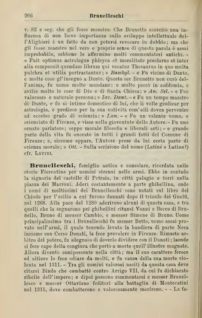 v. 82 e seg. che gli fosse maestro. Che Brunetto esercitò una influenza di non lieve importanza sullo sviluppo intellettuale dell'Alighieri è un fatto da non potersi revocare in dubbio; ma che gli fosse maestro nel vero e proprio senso di questa parola è assai improbabile, sebbene lo affermino molti commentatori antichi. -« Fuit optimus astrologus phisyca et moralitate preclarus et inter alia composuit quendam librum qui vocatur Thesaurus in quo multa pulchra et utilia pertractantur ; » Bambgl. - « Fu vicino di Dante, e molte cose gì'insegnò a Dante. Questo ser Brunetto non curò dell'anima, fu uomo molto mondano; e molto peccò in soddomia, e avilìo molto le cose di Dio e di Santa Chiesa; » An. Sei. - « Fue valorosso e naturale persona;» Iac. Dant. -« Fu un tempo maestro di Dante, e fu sì intimo domestico di lui, che li volle giudicar per astrologia, e predisse per la sua natività com'elli dovea pervenire ad eccelso grado di scienzia ;» Lan. -« Fu un valente uomo, e scienziato di Firenze, e visse nella gioventute dello Autore.-Fu uno ornato parlatore; seppe morale filosofia e liberali arti;-e grande parte della vita fu onorato in tutti i grandi fatti del Comune di Firenze; e, siccome appare, l'Autore prese da lui certa parte di scienza morale; » Ott. - Sulla scrizione del nome (Latini o Latino?) cfr. Latini.