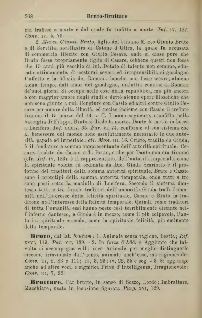 2. Marco Giunio Bruto, figlio del tribuno Marco Giunio Bruto e di Servilìa, sorellastra di Catone d'Utica, la quale fu accusata di commercio illecito con Giulio Cesare, onde si disse pure clic Bruto fosse propriamente figlio di Cesare, sebbene questi non fosse che 15 anni più vecchio di lui. Dotato di talento non comune, educato ottimamente, di costumi severi ed irreprensibili, si guadagnò l'affetto e la fiducia dei Romani, benché non fosse scevro, almeno alcun tempo, dall'amor del guadagno, malattia comune ai Romani de'suoi giorni. Si occupò nelle cose della repubblica, ma più ancora e con maggior amore negli studi e dettò alcune opere filosofiche che non sono giunte a noi. Congiurò con Cassio ed altri contro Giulio Cesare per amore della libertà, ed uccise insieme con Cassio il creduto tiranno il 15 marzo del 44 a. C. L'anno seguente, sconfìtto nella battaglia di Filippi, Bruto si diede la morte. Dante lo mette in bocca a Lucifero, Inf. xxxiv, 65. Par. vi, 74, conforme al suo sistema che al benessere del mondo sono assolutamente necessarie le due autorità, papale ed imperiale; cfr. Mon. ni, 16. Cristo, tradito da Giuda, è il fondatore e sommo rappresentante dell' autorità spirituale ; Cesare, tradito da Cassio e da Bruto, e che per Dante non era tiranno (cfr. Inf. IV, 123), è il rappresentante dell'autorità imperiale, come la spirituale voluta ed ordinata da Dio. Giuda Scariotto è il prototipo dei traditori della somma autorità spirituale, Bruto e Cassio sono i prototipi della somma autorità temporale, onde tutti e tre sono posti sotto la maciulla di Lucifero. Secondo il sistema dantesco tutti e tre furono traditori dell'umanità: Giuda tradì l'umanità nell' interesse della felicità spirituale, Cassio e Bruto la tradirono nell'interesse della felicità temporale. Quindi, come traditori di tutta l'umanità, essi hanno posto così terribilmente distinto nell'inferno dantesco, e Giuda è in mezzo, come il più colpevole, l'autorità spirituale essendo, come la spirituale felicità, più eminente della temporale.