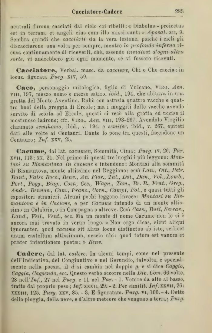 Cadere, dal lat. cadere. In alcuni tempi, come nel presente dell'Indicativo, del Congiuntivo e nel Gerundio, talvolta, e specialmente nella poesia, il d si cambia nel doppio g, e si dice Caggio, Gaggia, Caggendo, ecc. Questo verbo occorre nella Div. Com. 66 volte, 28 nell'In/., 27 nel Purg. e 11 nel Par. - 1. Venire da alto al basso, tratto dal proprio peso ; Inf. xxxii, 29. - 2. Per similit. Inf. xxvii, 26 ; xxxni, 125. Purg. xxv, 85. - 3. E figuratam. Purg. vi, 100.-4. Detto della pioggia, della neve, e d'altre meteore che vengono a terra; Purg.