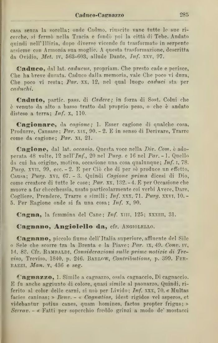 Cagiono, dal lat. occasio. Questa voce nella T)iv. Com. è adoperata 48 volte, 12 neWInf., 20 nel Purg. e 16 nel Par.- 1. Quello da cui ha origine, motivo, occasione una cosa qualunque; Inf. i, 78. Purg. xvit, 99, ecc. - 2. E per Ciò che di per sè produce un effetto, Causa; Purg. xvi, 67. - 3. Quindi Cagione prima dicesi di Dio, come creatore di tutte le cose; Par. xx, 132.-4. E per Occasione che muove a far checchessia, usato particolarmente coi verbi Avere, Dare, Cogliere, Prendere, Trarre e simili; Inf. xxx, 71. Purg. xxvi, 10.-5. Per Ragione onde si fa una cosa; Inf. x, 90.